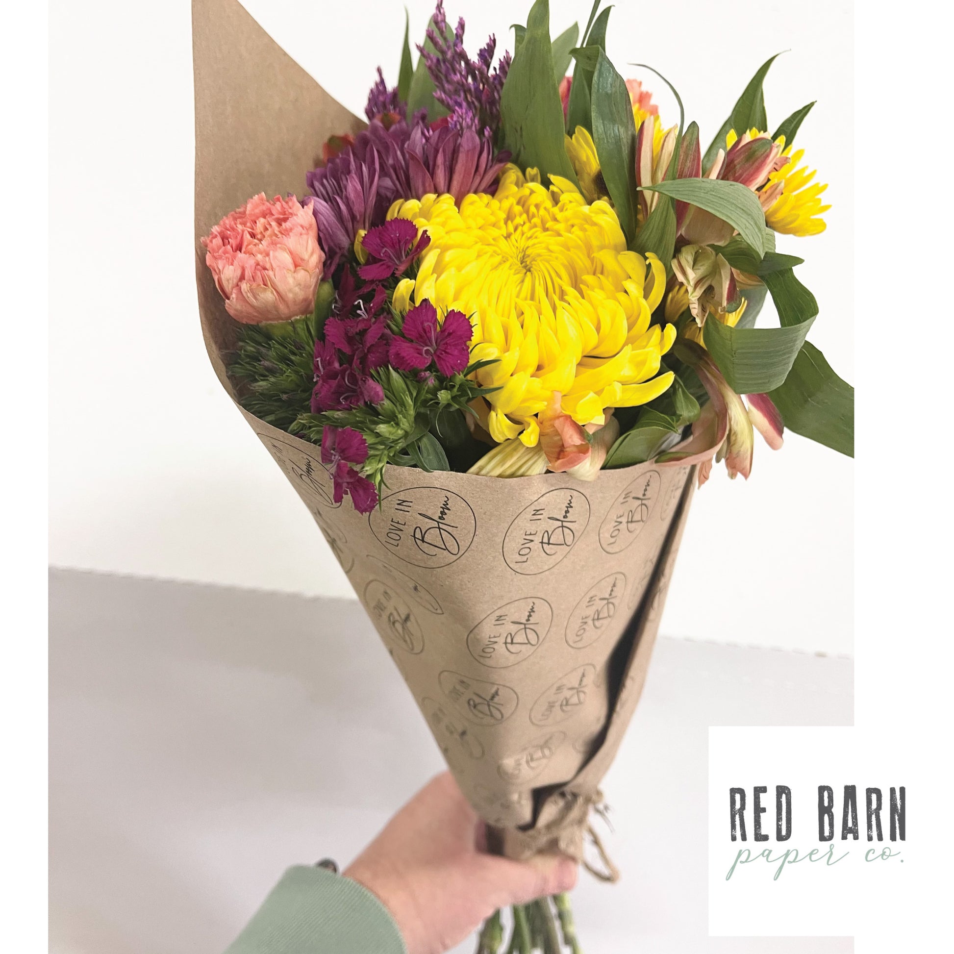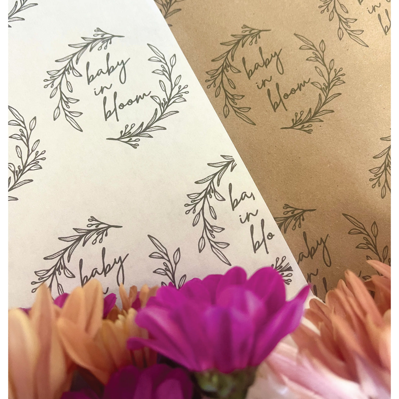 These 18" x 18" wraps are crafted from premium kraft paper and printed with a playful Baby In Bloom script, perfect for wrapping fresh blooms as memorable favors. Whether you're going for soft neutrals, bold florals, or a layered kraft look, these wraps are the perfect detail your guests will love.
