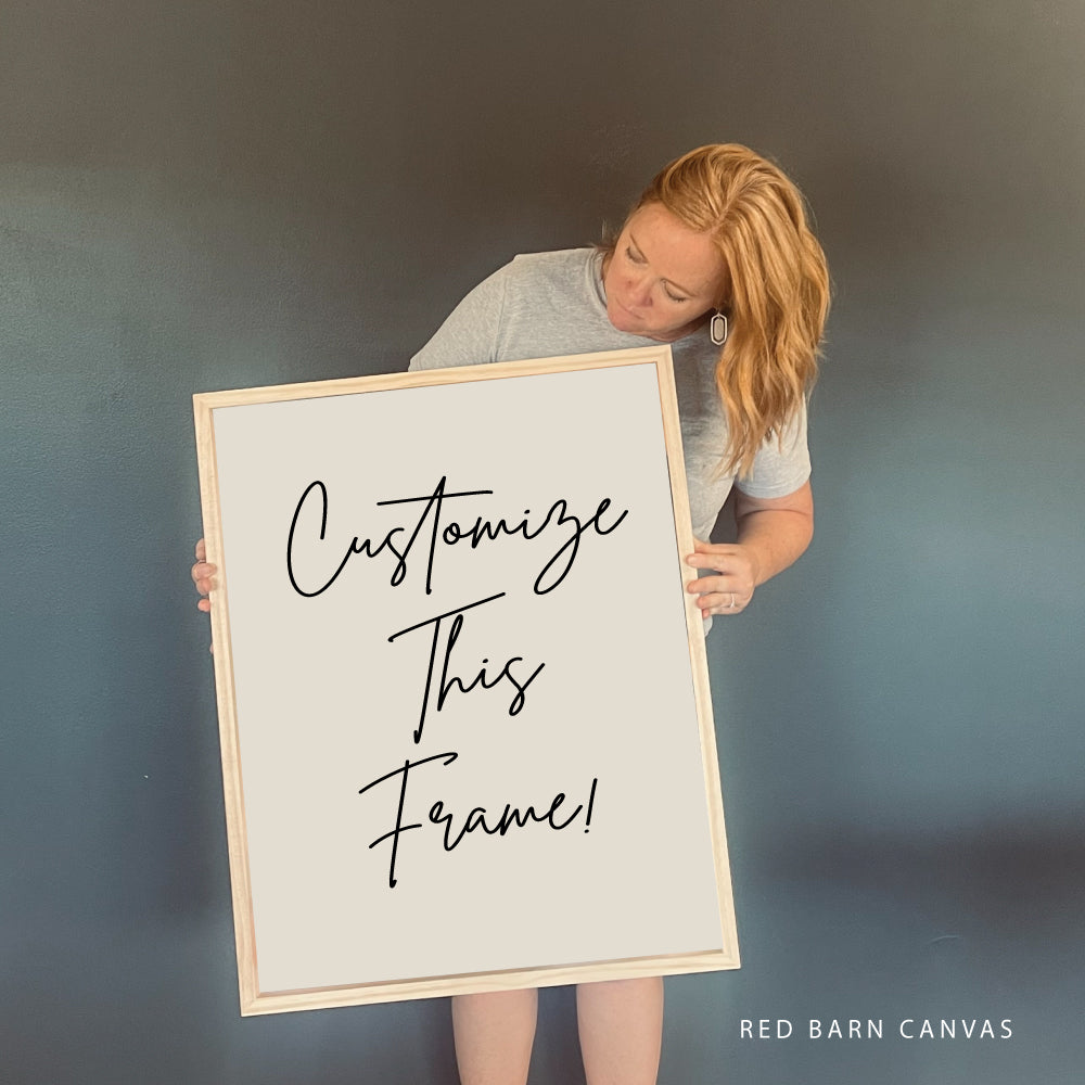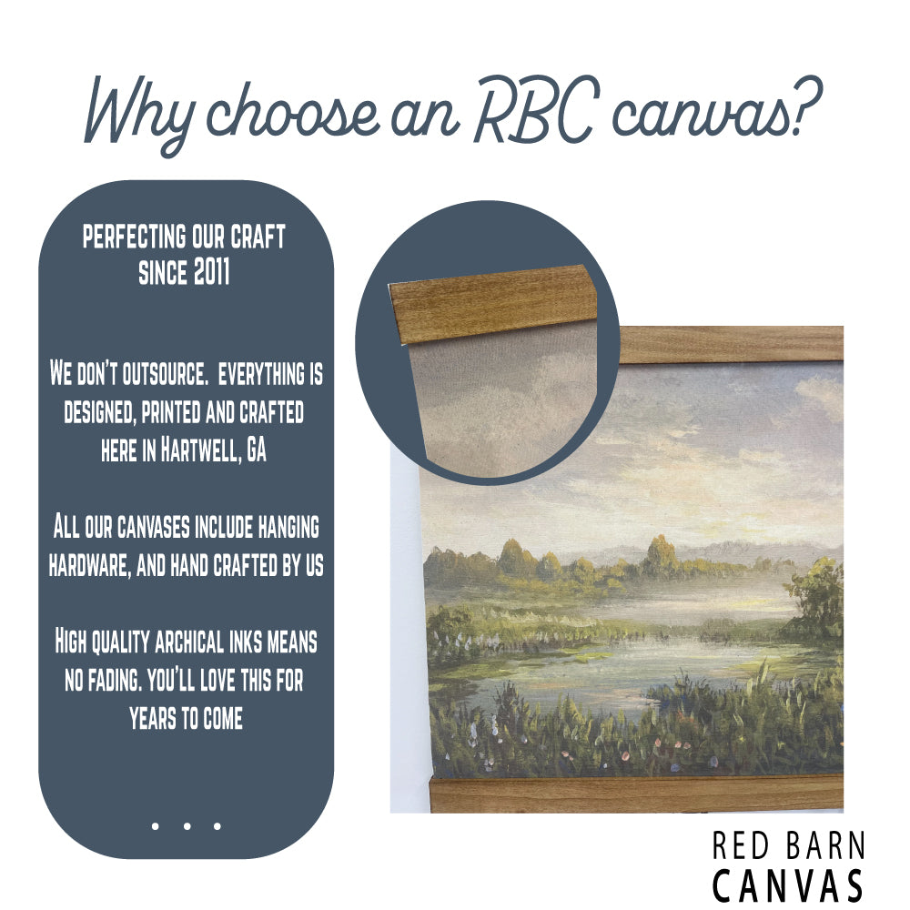 We print your digital download, favorite photo or art file. Just send us your file and we will print on our premium cotton canvas material and finish it with a solid wood handcrafted frame. Our wood is sourced locally here in Hartwell, GA and handcrafted by our family for yours.