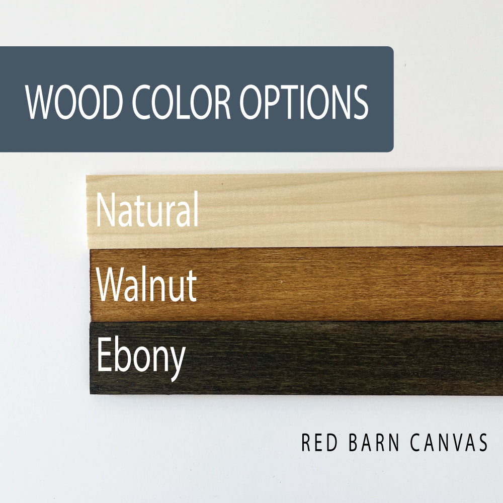 Printed on our premium cotton canvas mounted and finished with a solid wood handcrafted frame in your choice of stain colors. Hanging hardware is installed.