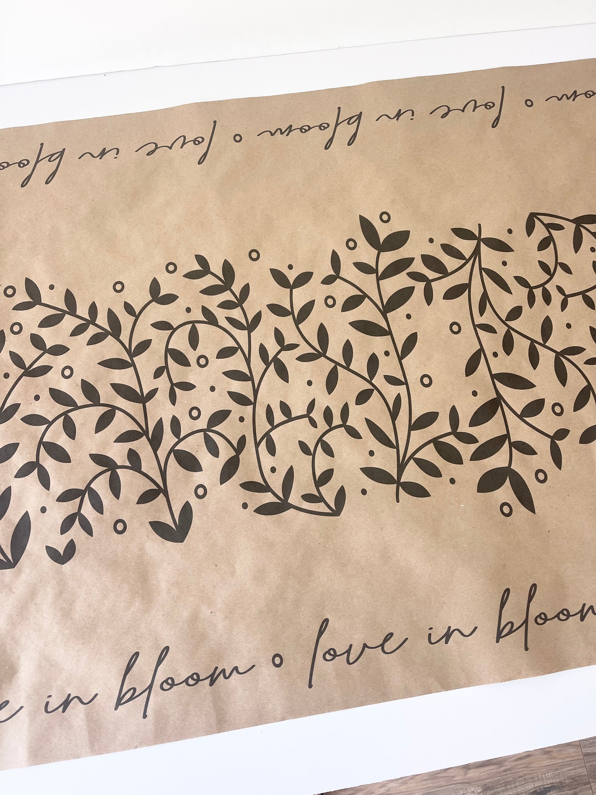 Love in Bloom Paper Table Runner on a Roll, 30" x 25' Bring romance to the table with our Love in Bloom table runner. Featuring a charming floral design, this roll measures 30 inches wide by 25 feet long—large enough to cover four standard 6-foot tables. Crafted from premium, food-safe kraft paper with rich, full-coverage printing and vibrant, garden-inspired colors. A beautiful accent for weddings, bridal showers, engagement parties, and spring gatherings. Versatile and easy to use—cut to size for table décor, gift wrap, or creative DIY projects.