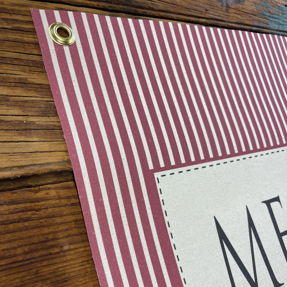 Add cozy Christmas charm to your home with this festive canvas banner printed on our premium natural canvas. The classic red striped border gives it a preppy holiday vibe perfect for mantels, entryways, or holiday gallery walls. Lightweight, durable, and easy to hang—your new favorite holiday décor piece.